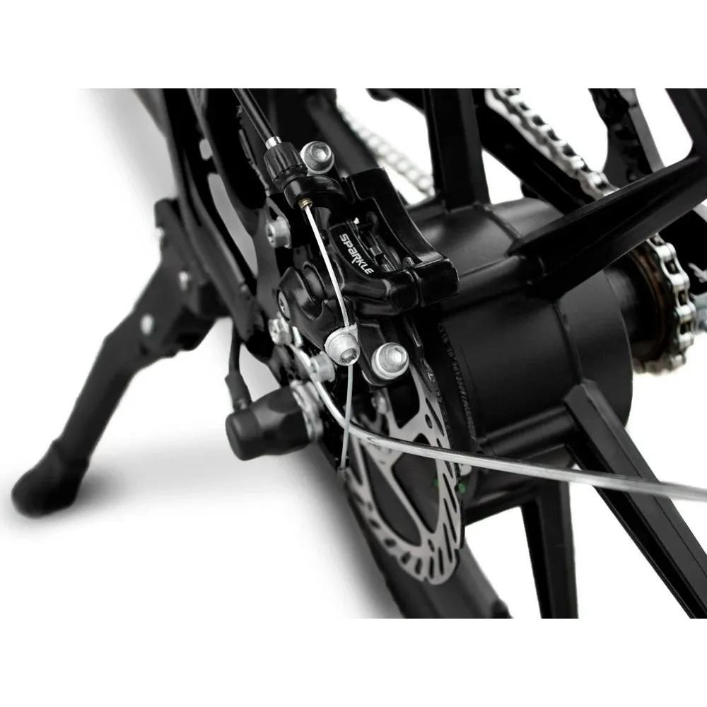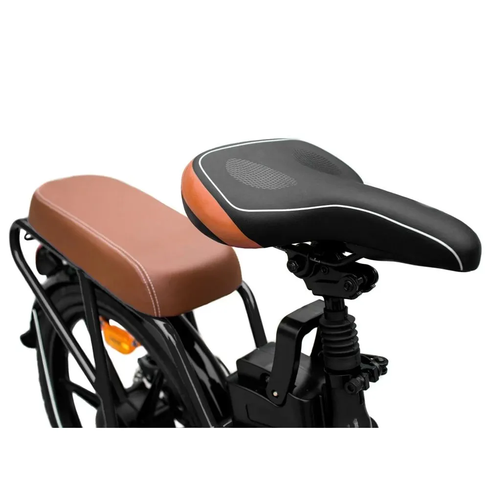 Электровелосипед Unimoto NOTE – комфортная техника для прогулок по дизайну напоминает мопед. Стильный дизайн, мощная рама, 20-дюймовые колеса и наличие пассажирского сиденье – чего желать лучшего для совместных прогулок! Передняя часть оснащена небольшим багажником, вместимости которого хватает для продуктов питания, тормозка и небольшой сумки. Заднее мягкое сиденье удобно для ребенка, который не прочь как и родители провести время на свежем воздухе.
