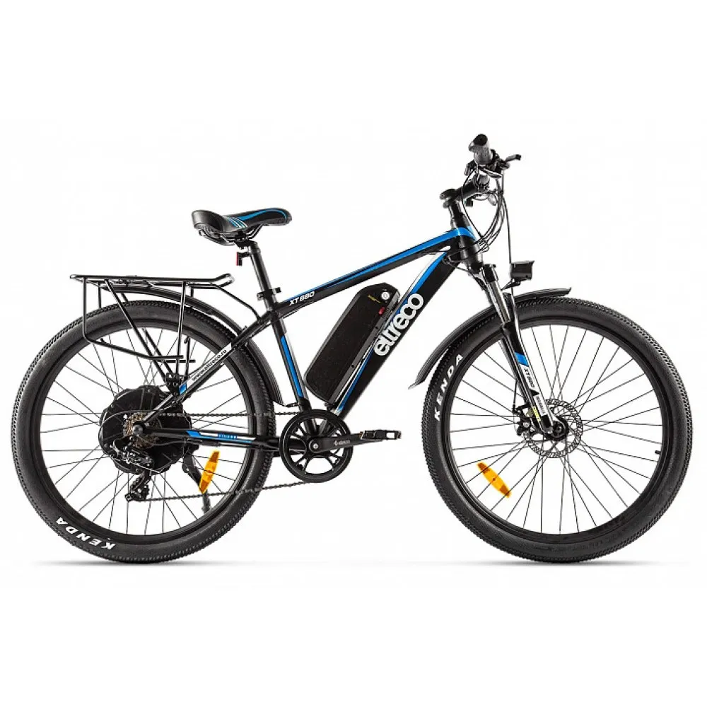 Велогибрид Eltreco XT880D - обновлённая модель от надежного российского производителя, в которой качество исполнения сочетается с комфортом эксплуатации. Электровелосипед создан для езды как по городским улицам, так и по горным и грунтовым дорогам. Мощный двигатель прямого привода обеспечивает плавный разгон до максимально допустимой отметки 35 км/час. Питает двигатель емкий литий-ионный аккумулятор, на полном заряде которого велогибрид способен преодолеть до 70 километров.  Аккумулятор расположен под рамой и легко снимается для более удобной подзарядки. Большие 27,5-дюймовые колёса и амортизатор обеспечивают мягкий и плавный ход при движении даже по неровной поверхности. Для комфортной поездки все детали электровелосипеда продуманы до мелочей. Улучшенное седло эргономичной формы обеспечивает удобную посадку, а прорезиненные ручки руля исключают соскальзывание рук во время совершения любых маневров. Благодаря складной металлической подножке велогибрид легко припарковать в любом удобном месте, даже если рядом нет никакой опоры. Велогибрид Eltreco XT880D оснащён крупным ЖК-дисплеем, с помощью которого райдер может отслеживать показатели скорости, пройденного расстояния и уровня заряда батареи.