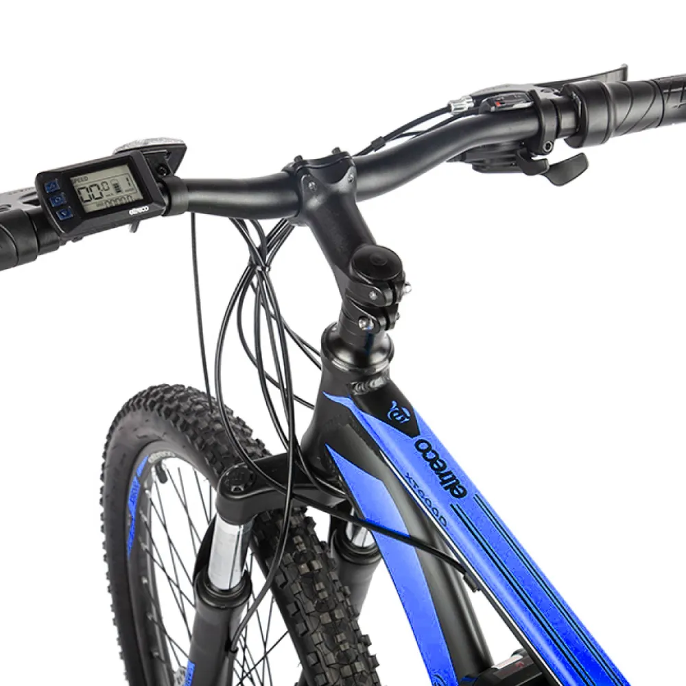 Велогибрид Eltreco XT 600 – доступная и востребованная на рынке электровелосипедов модель. В сравнении с предыдущими вариантами имеет облегченную алюминиевую раму, сглаженную геометрию, в которой нельзя найти острых углов. черно-синяя модель велосипеда сочетает в себе роскошь и многофункционал. Общий вес велика – 20 кг. При разработке модели производитель использовал оригинальные брендовые запчасти, что сделало срок службы техники длительным. Технические особенности электровелосипеда следующие: